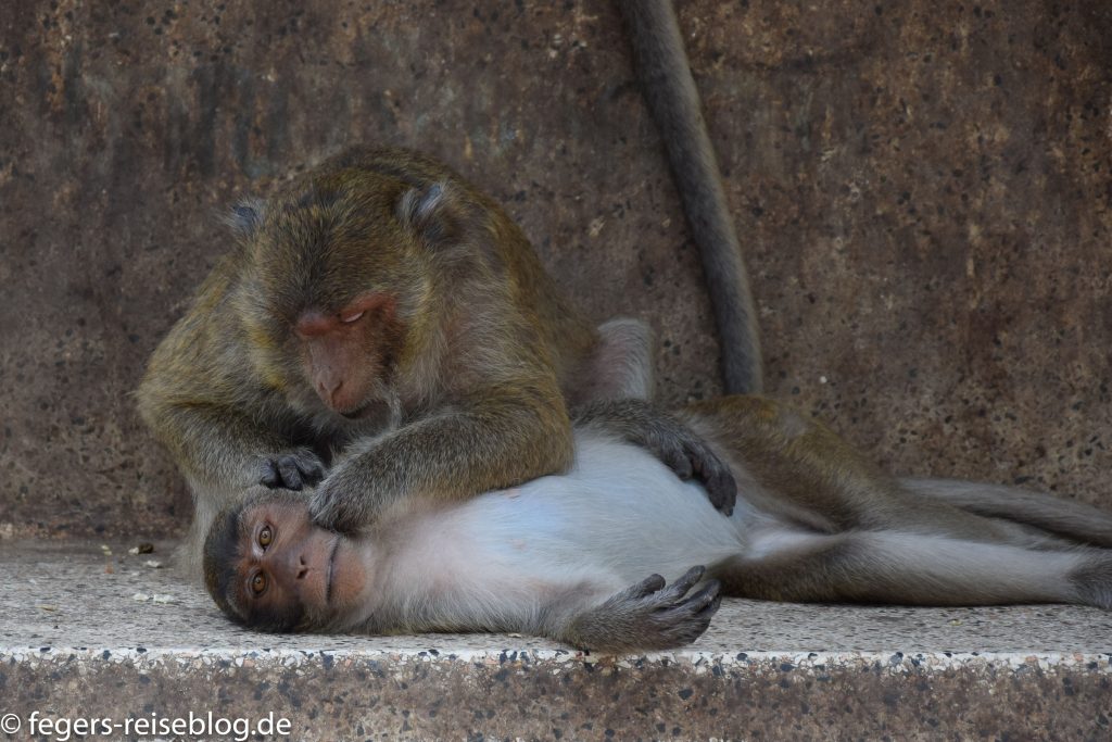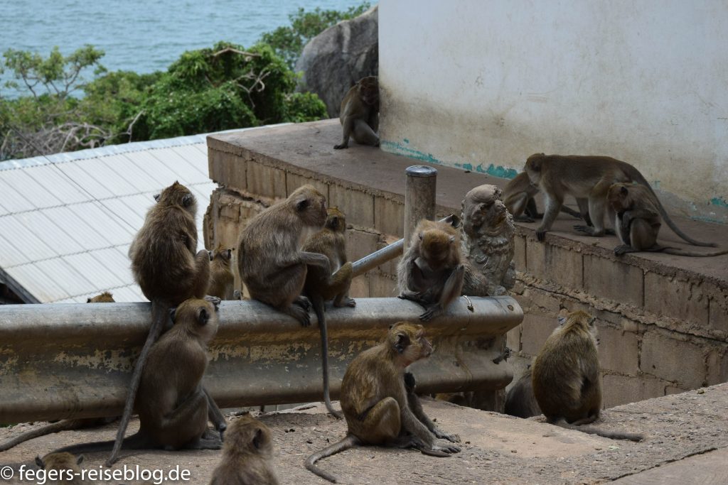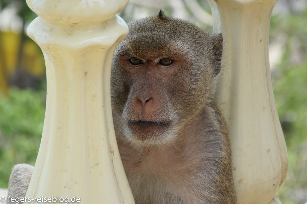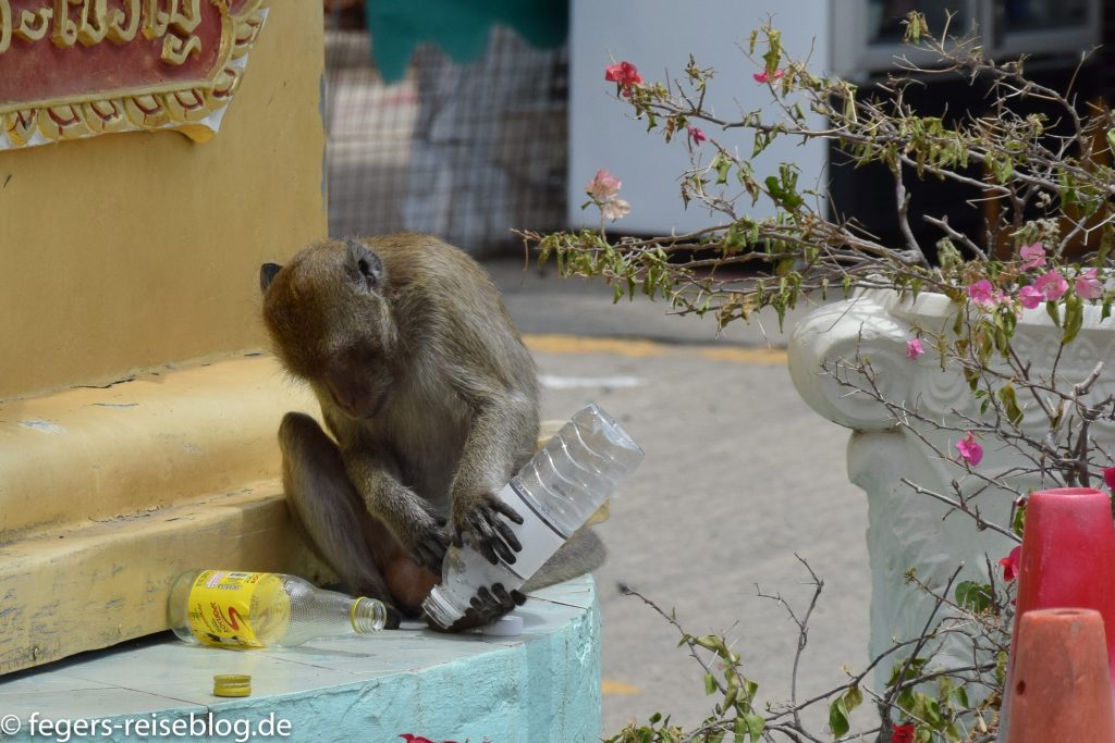 Auf dem Affenberg naha Hua Hin können sich Affen nicht nur frei bewegen, sie werden sogar gefüttert. Als Tourist sollte man sich allerdings in Acht nehmen – sie klauen alles, was nach Essen oder Trinken aussieht.