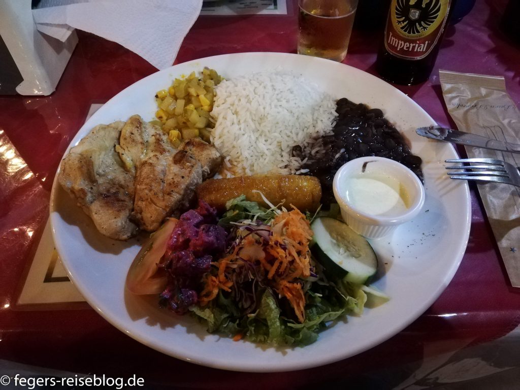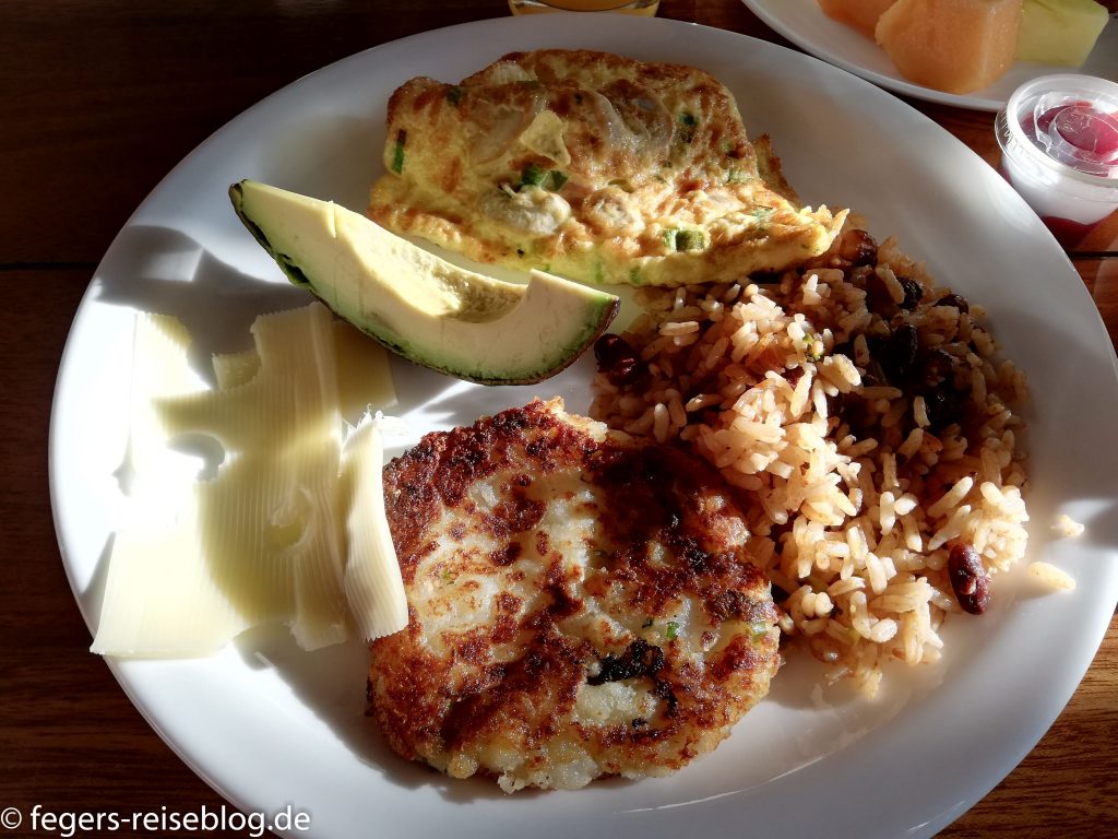 Das Herz der costa-ricanischen Küche ist Reis und Bohnen. Zum Frühstück gibt es Gallo Pinto („Schwarzer Hahn“): Reis und schwarze Bohnen gemischt. Zum Abendessen gibt es traditionellerweise Casado: Reis und schwarze Bohnen separat, dazu Fleisch oder Fisch. Mittags kann man selbstverständlich in einem kleinen Lokal, Soda genannt, auch Reis mit Bohnen bekommen, aber auch andere Snacks. Beliebt sind bei den Einheimischen auch Imbissbuden mit Pollo Frito (frittiertes Hühnchen) oder Pizza. Zu trinken gibt es häufig eine große Auswahl an frischen Obstsäften, aber auch gewöhnungsbedürftige Getränke wie Leinsamensaft (Linaza).