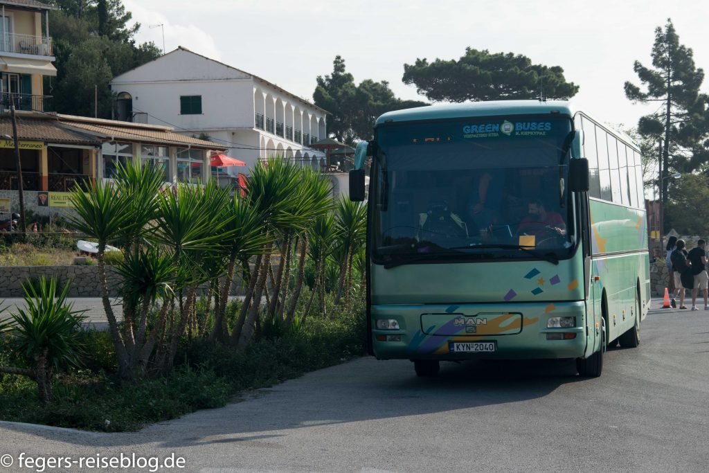 Den Ort erreicht man am besten mit den „Green Buses“, den öffentlichen Überlandbussen – klimatisiert und ohne Parkplatzsorgen kommt man z.B. in 50 Minuten für 2,30 € von der Hauptstadt nach Paleokastritsa.