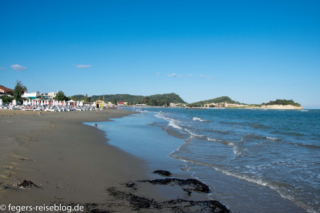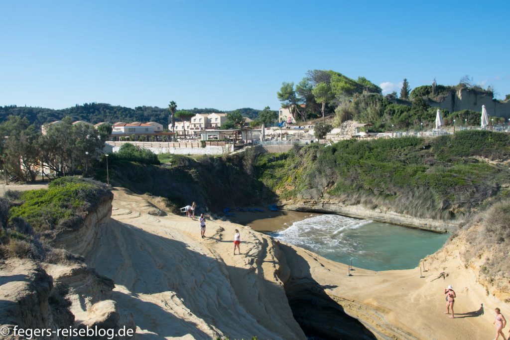 Das Beste an Sidari ist der Strand: zwischen einer kleinen Hafenmole und den Klippen erstreckt sich ein Badestrand mit feinem Sand, gesäumt von Restaurants mit Sonnenliegenverleih. Die Sonnenliegen gibt es meistens kostenlos, wenn man beim Sonnenbaden etwas beim mehr oder weniger schnell herbeieilenden Kellner bestellt – zum Beispiel einen Eiscafé, das Lieblingsgetränk der Griechen.