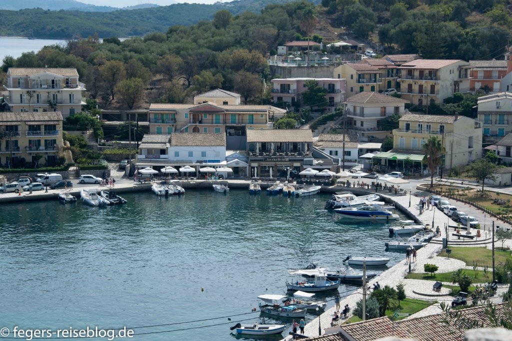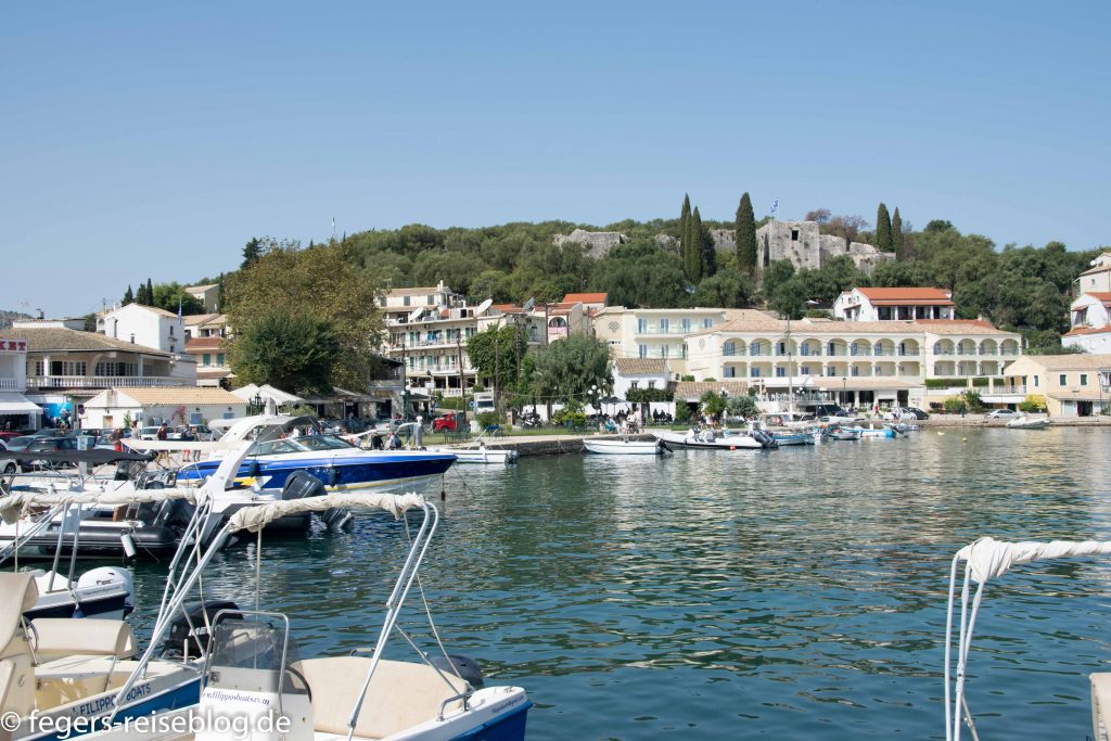 Die Stadt Kassiopi wir von einer Burgruine überragt. Unten am Hafen laden Cafés und Restaurants zum Verweilen ein. Nicht zu verachten: der Orangenkuchen im Hot Spot Café!