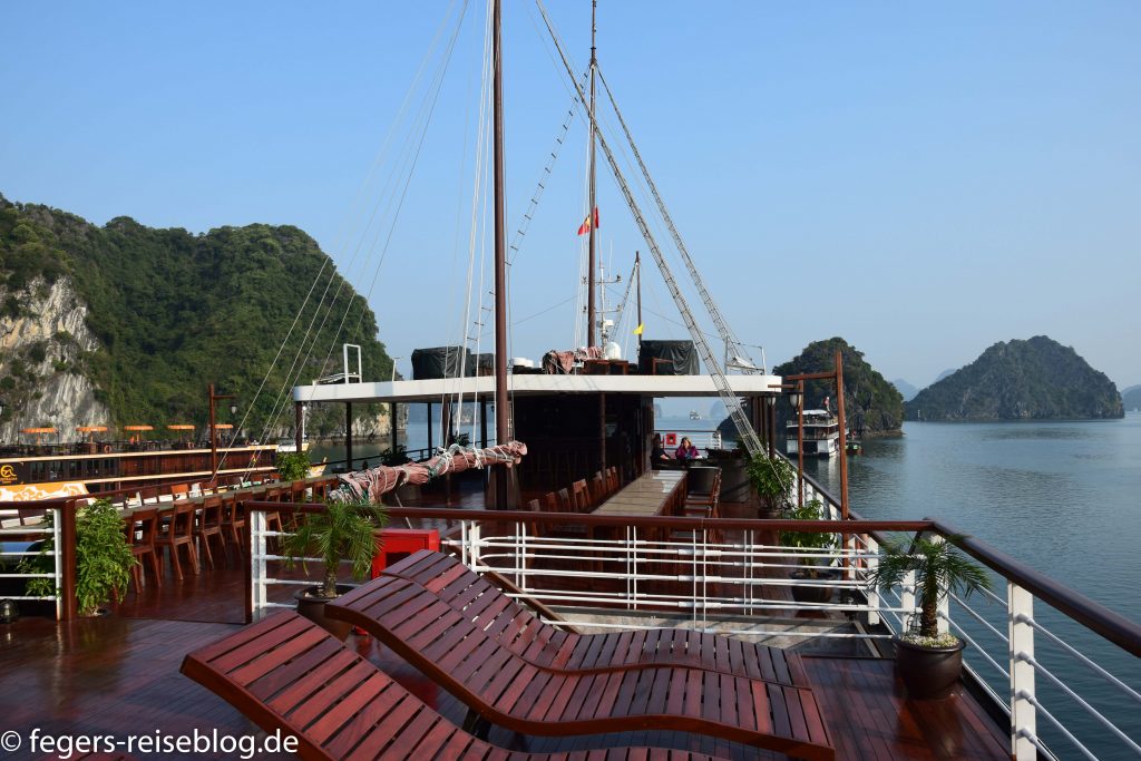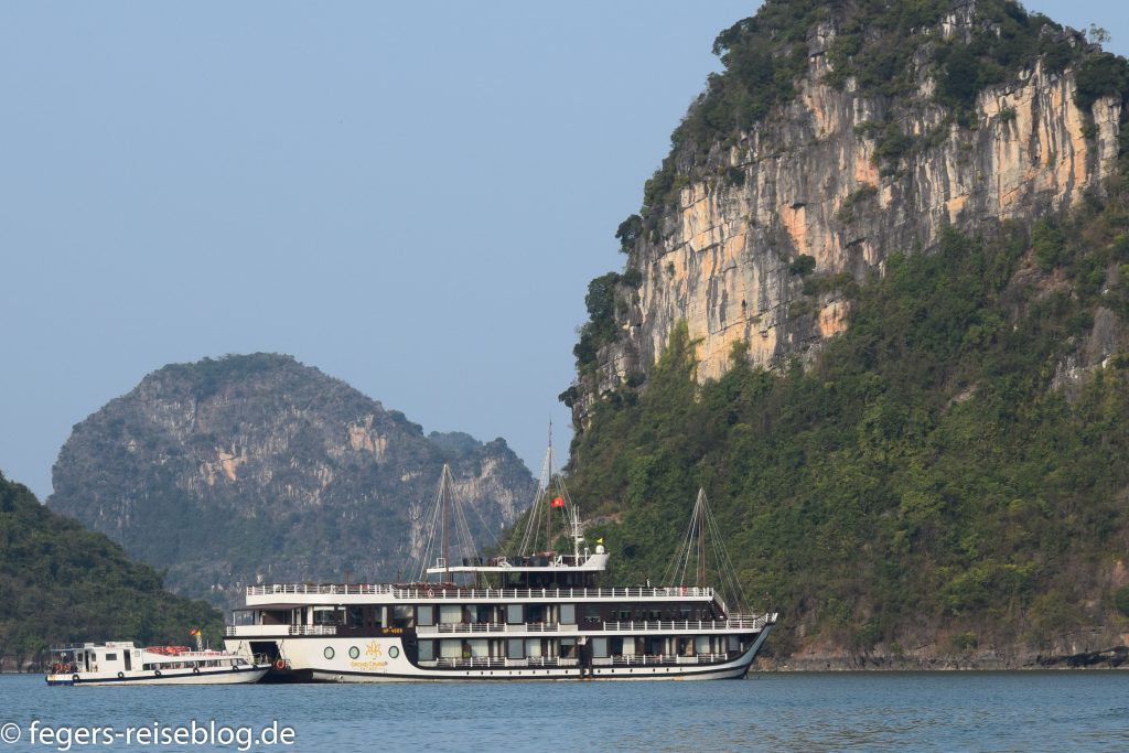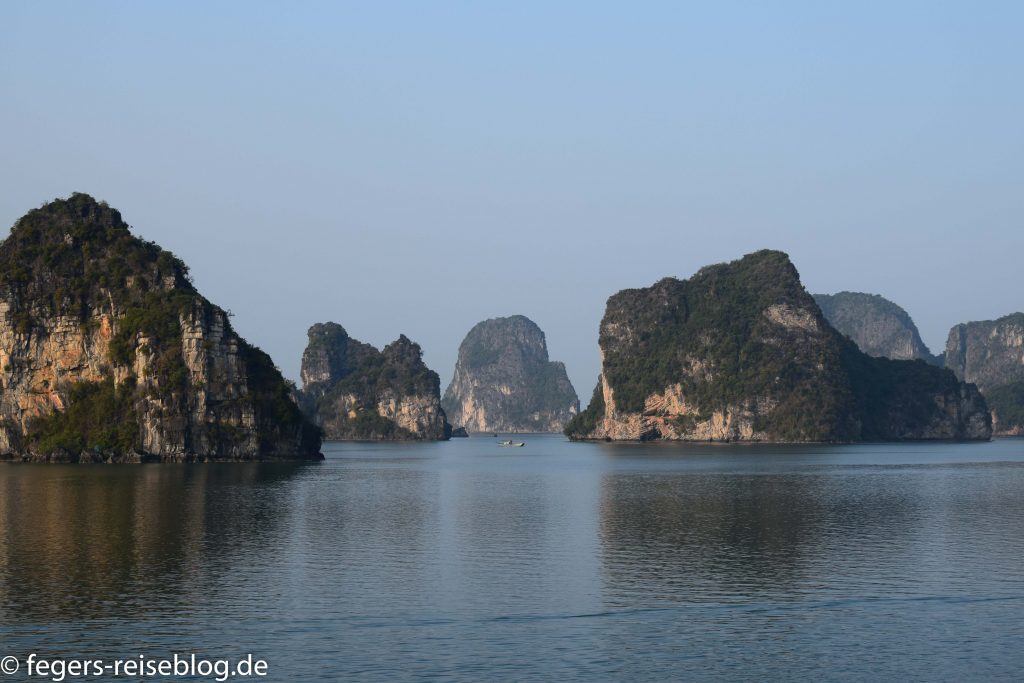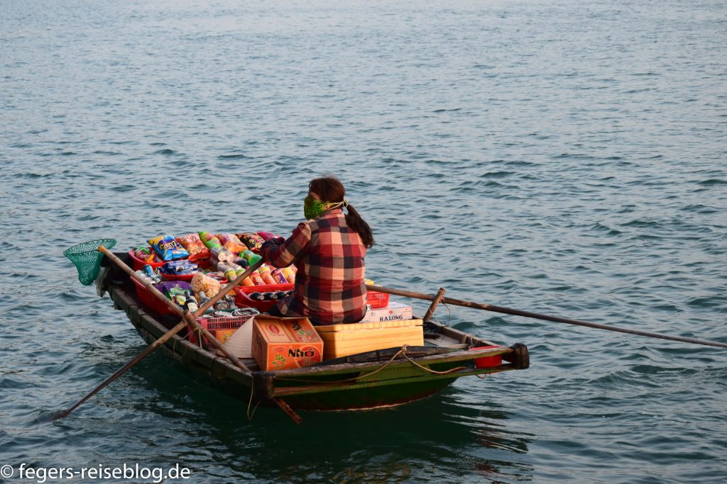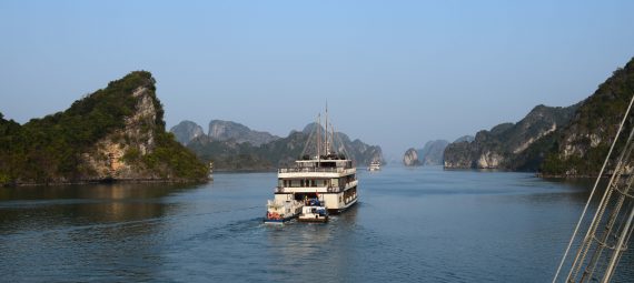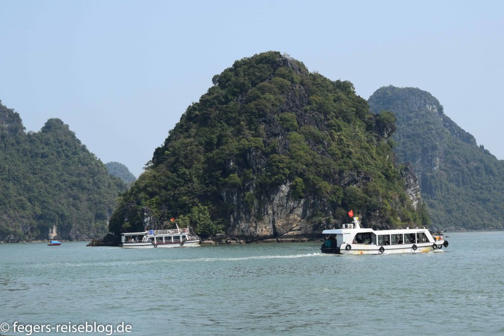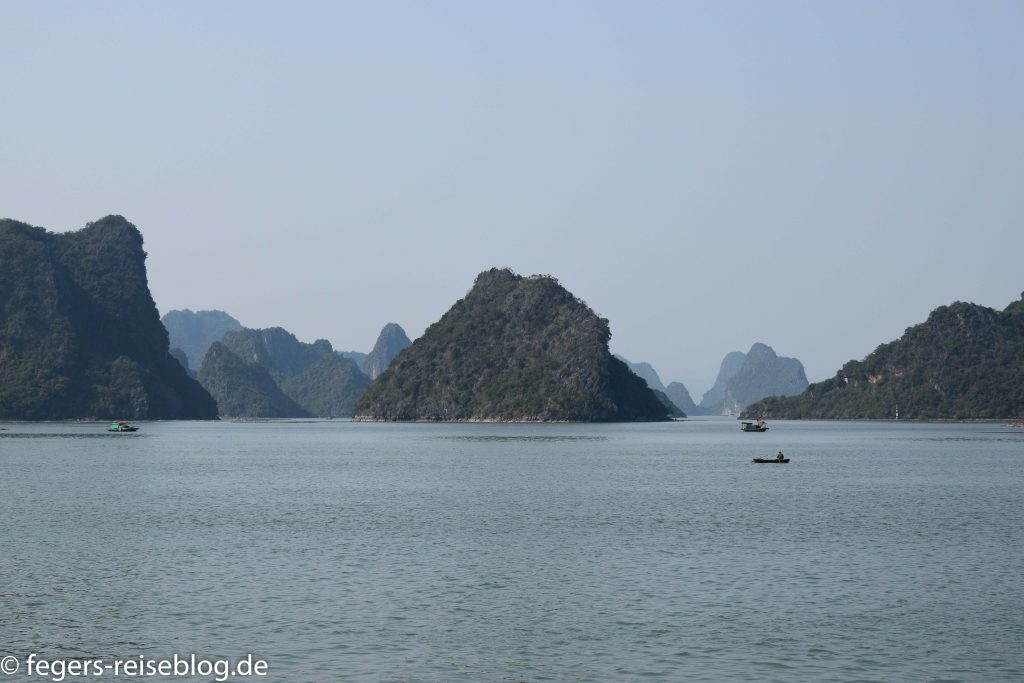 In der Ha-Long-Bucht im Nordosten Vietnams finden sich 2000 kleine Inseln. Die steilen Hänge der Kalksteinfelsen und die dicht bewaldeten Kuppen geben der Landschaft ein spektakuläres Aussehen, das man ambesten an Bord eines der vielen Ausflugsschiffe bewundert. Viele dieser Schiffe sind mit luxuriösen Kabinen und einer reichhaltigen Gastronomie ausgestattet. Trotzdem wird man regelmäßig von „fliegenden Händlern“ in kleinen Booten besucht.