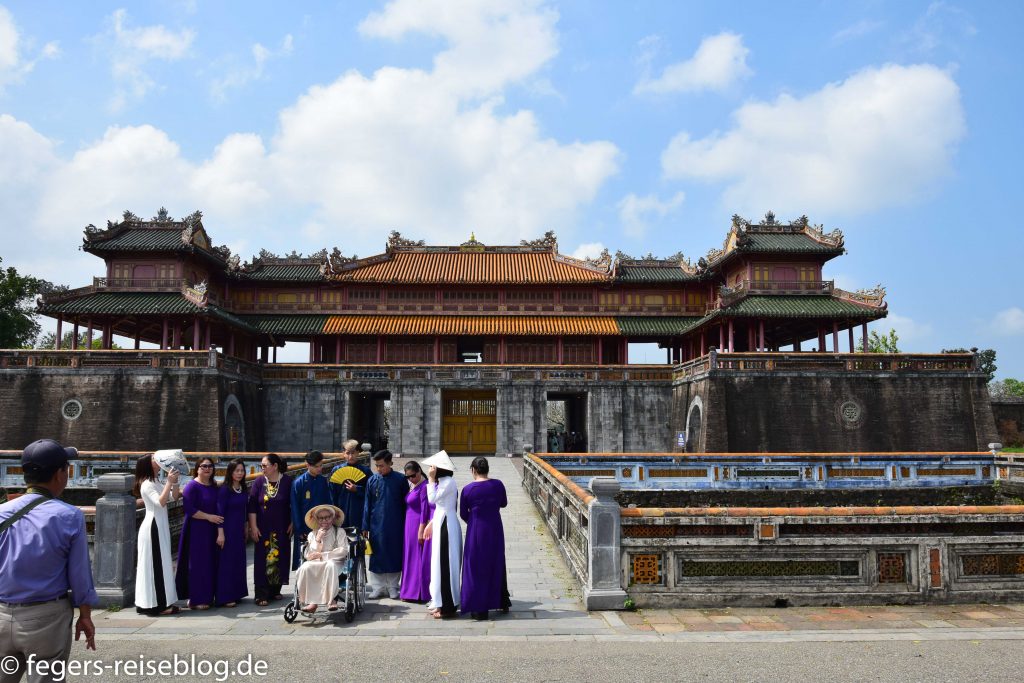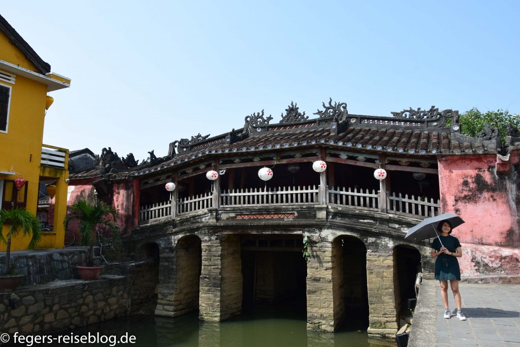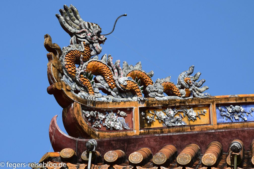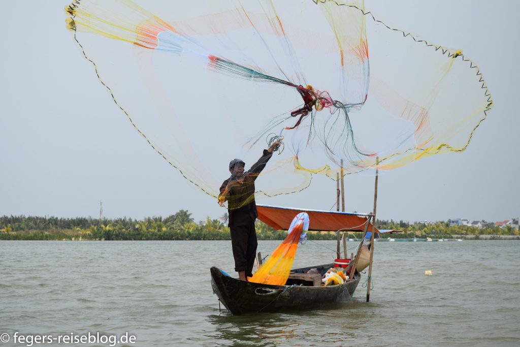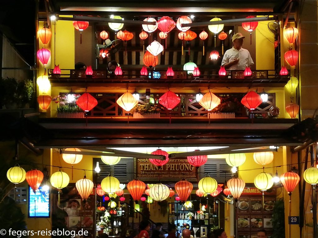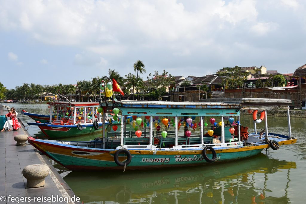 Der Eingang zum Kaiserpalast – Einheimische kleiden sich beim Besuch gerne in historische GewänderDen chinesischen Einfluss erkennt man am allgegenwärtigen DrachenschmuckTor zum inneren Bereich der PalastanlageIm Thronsaal sind alle Kaiser verewigtRobust gebautes kaiserliches WohngebäudeAuch an Hofmusikerinnen ist gedachtDie Japanische Brücke in Hoi AnDie Straßen von Hoi Ans Altstadt sind mit Lampions geschmücktWassertaxis oder für die abendliche romantische RundfahrtAbendstimmung in der Altstadt von Hoi AnIn einigen alten Häusern sind Museen untergebrachtEin altes japanisches HausEingang zum chinesischen TempelTouristenbespassung im Coconut VillageHier werden Fischernetze geworfenKrabbenfischen im Coconut VillageDie Drachenbrücke in Da Nang soll abends Feuer spucken