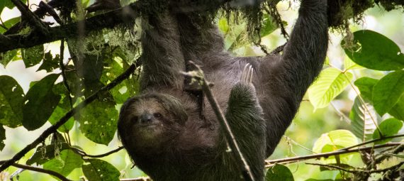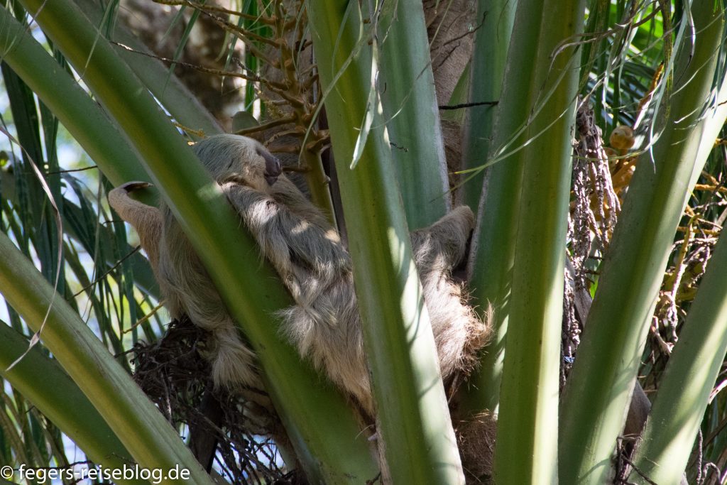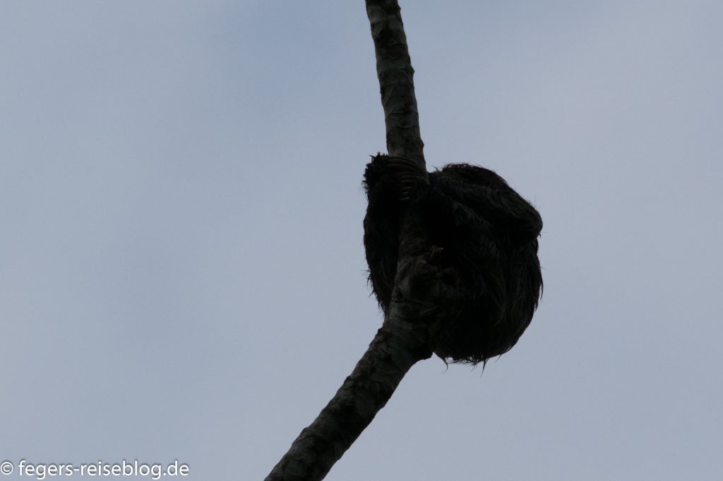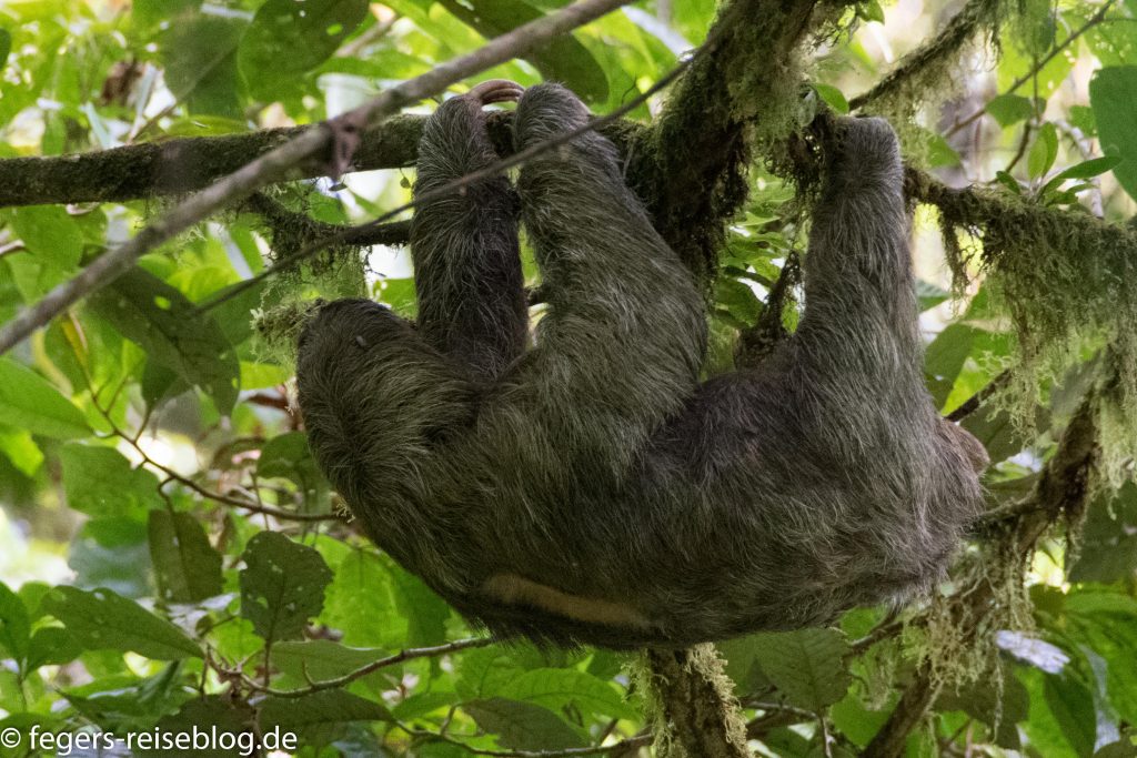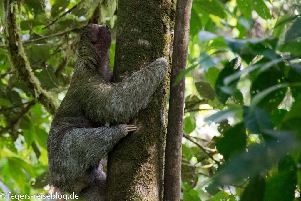 Eine sehr markante Spezies ist das Faultier. Es kommt in Costa Rica sehr zahlreich vor, hängt aber meistens als Fellknäuel in einer Baumkrone und ist dort schwer zu entdecken. Im Hängebrücken-Park am Vulkan Arenal war ein Faultier so freundlich, sich für uns von einem Baum zum nächsten zu bewegen.