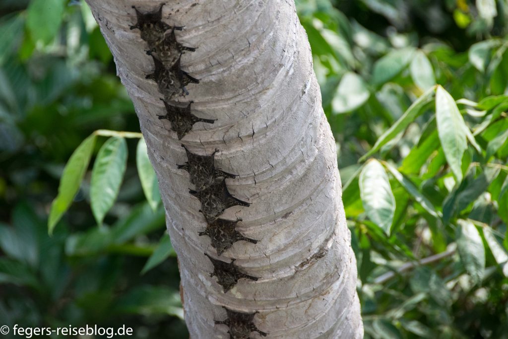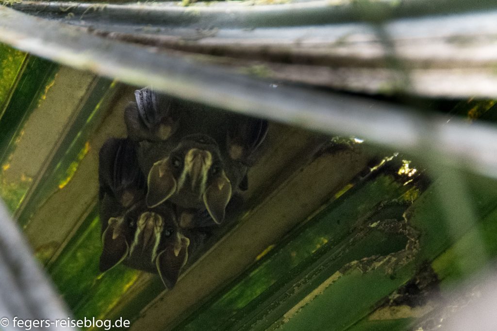 Fledermäuse sind nachtaktiv und dann shwer zu fotografieren. Gelegentlich findet man aber tagsüber ihre Schlafplätze, zum Beispiel unter Blättern versteckt oder ganz offen am Baum hängend, wobei sie auf ihre Tarnung vertrauen.