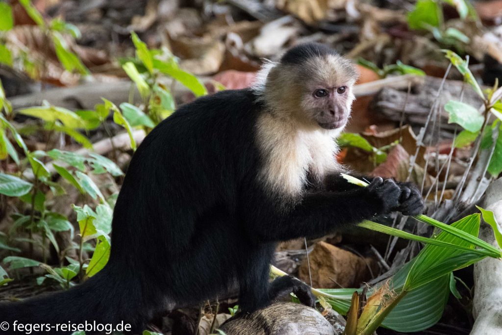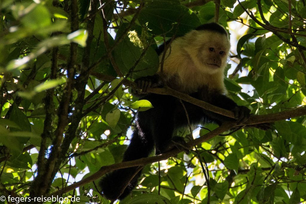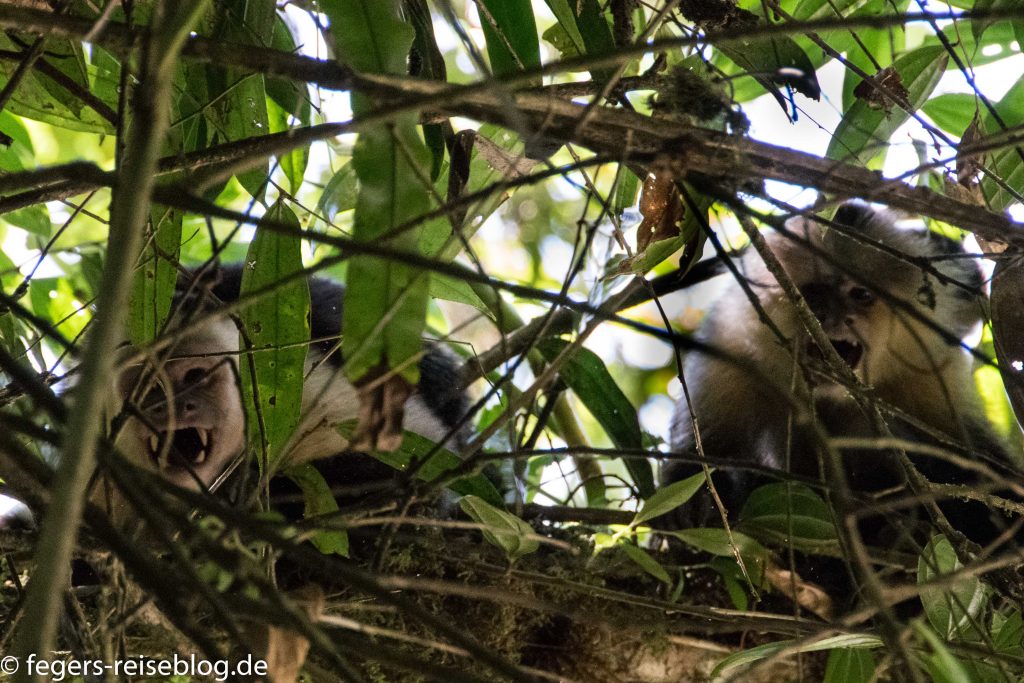 Weißschulterkapuzineräffchen durchstreifen den Regenwald in Gruppen nach Essbarem. Wenn sie sich dabei belästigt fühlen, wie bei uns im Tarpanti-Nationalpark, reagieren sie schon mal mit aggresiven Drohgebärden. Ganz anders sind sie an belebten Stränden drauf: hier müssen Touristen auf Ihren Rucksach aufpassen. Damit die Affen nicht gefüttert werden, verbieten die meisten Nationalparks das Mitbringen von Keksen und ähnlichem.