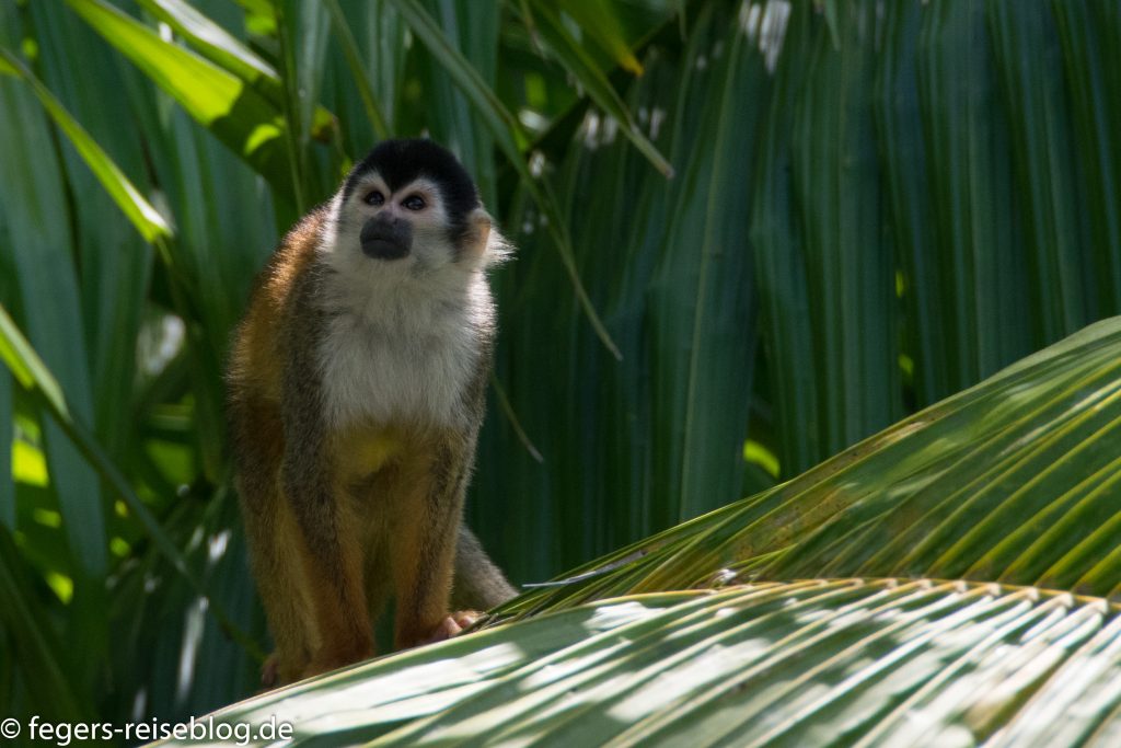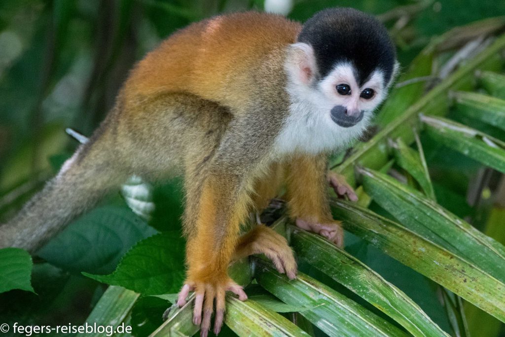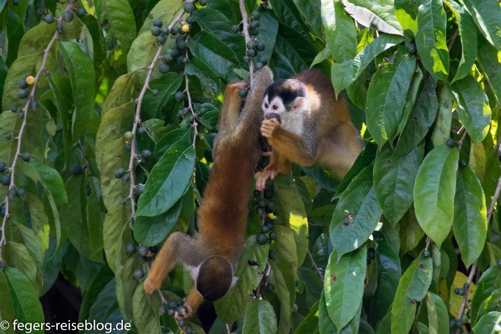 Die Rotrücken-Totenkopfaffen sind bekannt aus Piratenfilmen, in denen sie dem Kapitän als Haustier auf der Schulter sitzen, auch „Herr Nilsson“ bei Pipi Langstrumpf war ein Vertreter dieser Art. Auch Totenkopfäffchen strefen in Gruppen durch den Regenwald, um nach Nahrung zu suchen. Im Gegensatz zu den Kapuzieräffchen machen sie einen sehr friedlichen Eindruck, nichts kann sie scheinbar aus der Ruhe bringen. Schon gar nicht eine Gruppe von Touristen, die sie von einem Boot auf dem Rio Sierpe aus beobachtet und fotografiert.