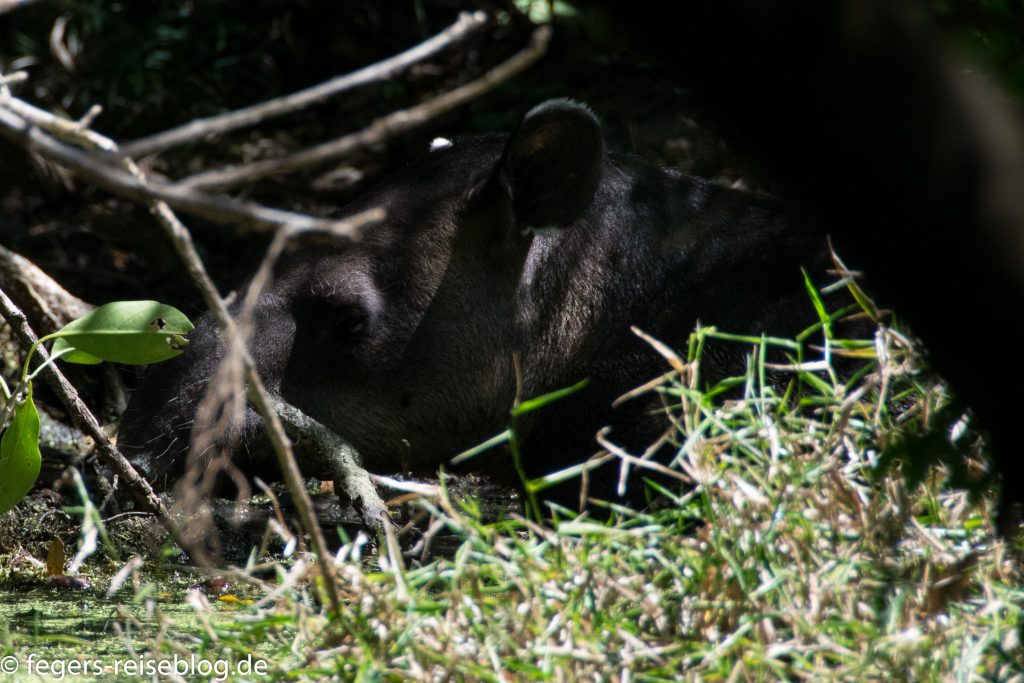 Tapire sind selten und scheu. Umso größer war die Freude, als uns Ranger des Nationalparks Rincón de la Vieja auf eine im Schlamm badende Riesin aufmerksam machte. Das Jungtier, das in ihrer Begleitung war, ist leider nicht zu sehen.