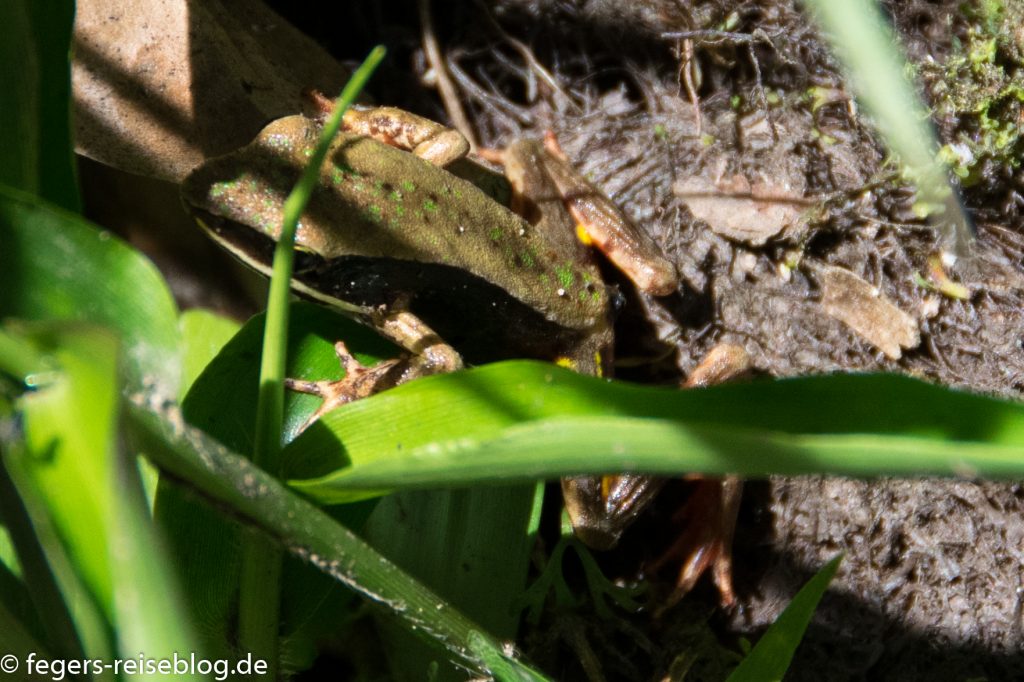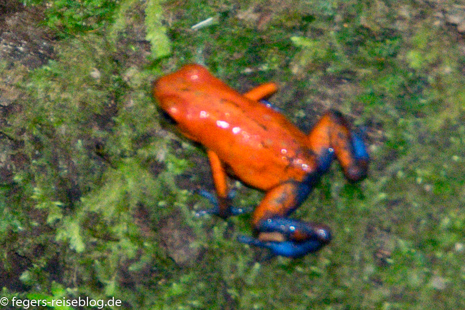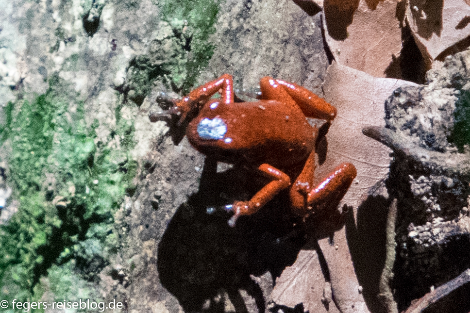 Die meisten Frösche, die sich im Regenwald tummeln, sind sehr klein, aber sie haben es in sich. Aus dem Gift der Pfeilgiftfrösche haben die Indianer früher – wie der Name vermuten lässt – das Gift für ihre Pfeile gewonnen. Eine Berührung mit einem solchen Frosch ist aber für den Frosch gefährlicher als für den Menschen, weil sie seine empfindlichen Schleimhäute verletzt.