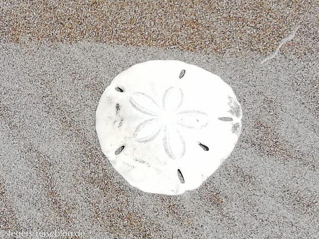 Ein besonderes Mitbringsel von den Stränden des Pazifiks ist der Stranddollar oder auch Sanddollar: das Skelett eines Seeigels mit dieser speziellen Form.